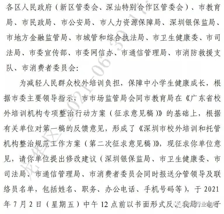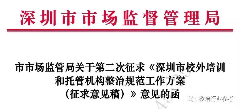 近日,深圳市市场监督管理局发布了市市场监管局关于第二次征求《深圳市校外培训和托管机构整治规范工作方案(征求意见稿)》,具体内容如下: