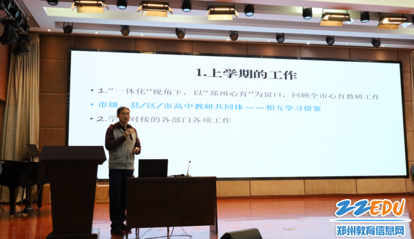 随后,郑州市基础教育教学研究室中小学心理健康教育教研员宫大志进行了教研培训,重点回顾了上学期全市心育教研工作的成效,围绕国家政策导向、省市工作推进、心育队伍建设、学生心理现状、课程活动需求等内容进行了系统梳理与深入交流。明确了本学期心理健康教育的工作重点,包括持续推进一体化课程建设、加强心育课程基本要求研究、提升专职教师个体辅导水平、推进郑州市高中生涯教育经验交流等。